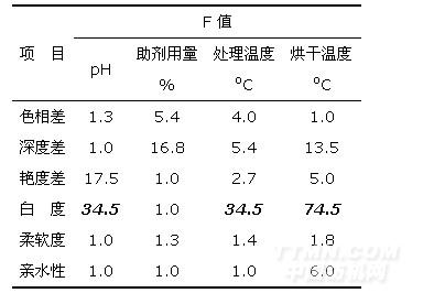 根據(jù)單因素實(shí)驗(yàn)結(jié)果,分別取處理浴pH5、6、7;助劑用量3、4、5%;處理浴溫度30、40、50oC和整理織物烘干溫度80、90、100oC進(jìn)行正交實(shí)驗(yàn),并對(duì)實(shí)驗(yàn)結(jié)果進(jìn)行方差分析。