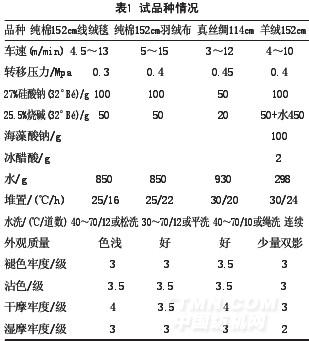 無錫市的色織廠引進了該機,從Dansk公司提供的400多個樣布看,無論在品質(zhì)或圖案質(zhì)量上,均達到國際一流水平。按照正常工藝要求在20℃以上的室溫下進行轉(zhuǎn)移印花,并在40℃以上的溫濕狀態(tài)堆置。該廠試生產(chǎn)是在0℃左右進行的,在一定程度上影響了產(chǎn)品質(zhì)量效果。試品種情況見表1