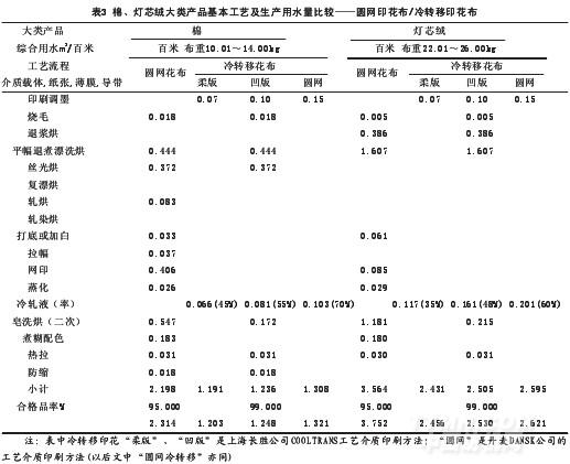 表2中就印花工藝對比,圓網(wǎng)印花工藝的水、電百米消耗量最高,萬元產(chǎn)值的水、電消耗量更高,說明其它三種印花產(chǎn)品附加值高。