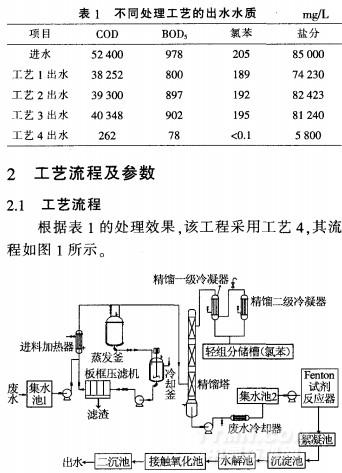 該化工廠(chǎng)廢水排放量約為10t/d。COD為52400mg/L左右,氯苯為205mg/L左右,鹽分約為85000mg/L,pH約為6。