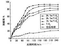 圖1為Tm/TiO2摩爾分數(shù)比對污物降解率的影響, TiO2和Tm/ TiO2溶膠質(zhì)量濃度均為0.5g/L,可見光源強度為21.0 mW/cm2。