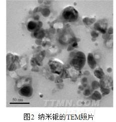 取一定量納米銀溶液,滴加于銅網(wǎng)上,自然晾干后用透射電鏡(TEM)觀察,結(jié)果如圖2所示。測試條件:加速電壓為200kV,點(diǎn)分辨率為0.24nm,線分辨率為0.14nm。