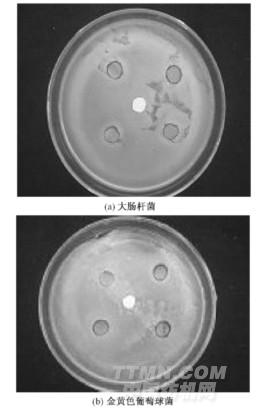圖4示出使用仙人掌納米銀整理后的桑蠶絲織物對大腸桿菌和金黃色葡萄球菌的抑菌圈。圖中間為未經(jīng)整理的桑蠶絲織物,周圍的4塊為整理過的織物??梢悦黠@看出,4塊整理過的織物有很好抑菌效果。