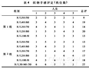 本文試驗(yàn)采用主觀評(píng)定法中的秩位評(píng)定法,先由數(shù)名檢驗(yàn)人員按各自的感覺對(duì)織物風(fēng)格水平做出判斷,對(duì)織物風(fēng)格的水平由高到低順序排隊(duì),排隊(duì)順序號(hào)1,2,3…,n,即為秩位數(shù)(n為織物試樣總數(shù))。然后將各檢驗(yàn)人員對(duì)每種織物打出的秩位數(shù)相加得到總秩位數(shù),最后根據(jù)總秩位數(shù)對(duì)這些織物風(fēng)格的優(yōu)劣水平進(jìn)行相對(duì)比較,作出感官評(píng)價(jià)的結(jié)果,如表4所示。第1組試樣:5種試樣為由不同混紡比的原料所紡制的32tex×2的股線雙根喂入織成的平紋針織物;第2組試樣:6種試樣為由不同混紡比的原料所紡制的32tex單紗單根喂入織成的平紋針織物。