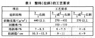 直線(xiàn)型緯斜的整緯(拉斜)工藝要求見(jiàn)表1(以下是針對(duì)常規(guī)的縮水整理的牛仔布)。