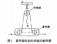利用緊布器改裝的單輥式整緯器(圖1),也可以起擴(kuò)幅作用。其操作簡(jiǎn)單,但只能對(duì)3。左右的緯斜進(jìn)行整緯,建議安裝在縮水機(jī)進(jìn)橡毯前。