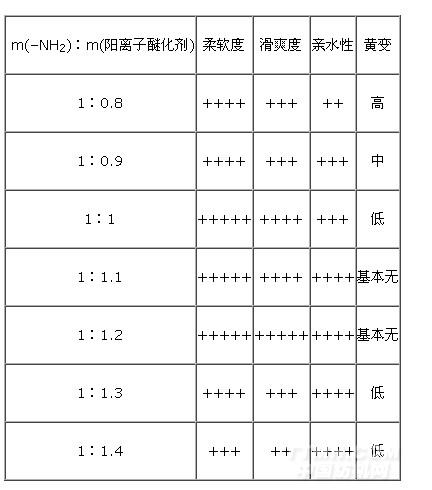 表4m(–NH2)︰m(陽(yáng)離子醚化劑)對(duì)新型超柔軟滑爽硅油性能的影響