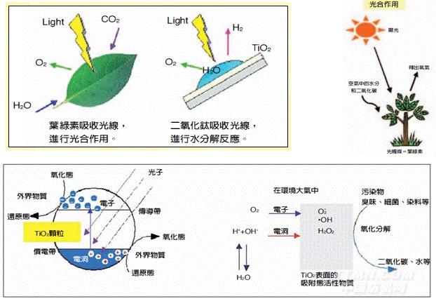 關(guān)于光觸媒的機理,除了葉綠素“天然的光觸媒“,在1960年日本學者發(fā)現(xiàn)“二氧化鈦(TiO2)經(jīng)光的照射后,將水(H2O)分解成氫和氧,同時借由二氧化鈦表面形成的電子﹝e ¯ ﹞及電洞﹝h ¯ ﹞能針對有機化合物進行分解,并重組H2O及CO2,所以光觸媒的機理,是分解作用,整個過程就像是一場有趣的搶電子游戲 ;當吸附一定量的有機物質(zhì)后,只要再經(jīng)過光源的照射,光觸媒可