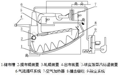 氣流柔軟整理機(jī)的工作原理,必須借助必要的結(jié)構(gòu)和控制功能來實(shí)現(xiàn)。每個(gè)結(jié)構(gòu)既有自身的作用特點(diǎn),同時(shí)又有與其它相關(guān)結(jié)構(gòu)的協(xié)調(diào)關(guān)系,只有這樣才能夠組合成為一個(gè)有機(jī)整體,共同完成工作的全過程。圖2為機(jī)器的結(jié)構(gòu)示意圖?,F(xiàn)對(duì)主要結(jié)構(gòu)功能進(jìn)行分析。