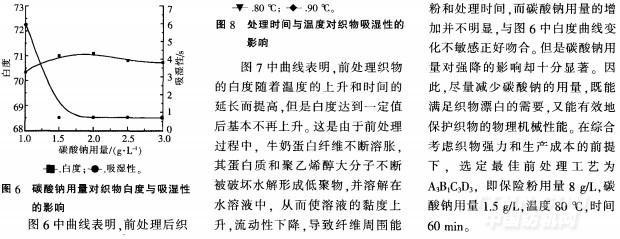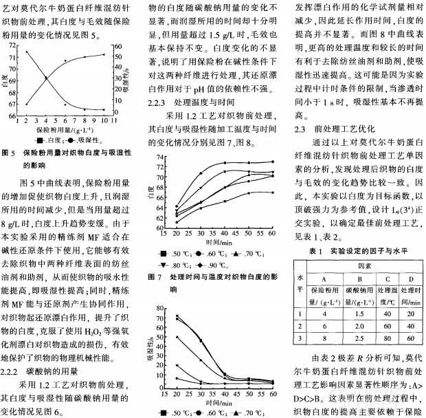 摘要:選用保險(xiǎn)粉和精練劑MF對(duì)莫代爾牛奶蛋白纖維混紡針織物進(jìn)行前處理。分析并測(cè)試了保險(xiǎn)粉用量、碳酸鈉用量、處理溫度和時(shí)間4個(gè)因素對(duì)織物白度、毛效、強(qiáng)力和失重率的影響,通過(guò)正交實(shí)驗(yàn)對(duì)前處理.Y-藝進(jìn)行優(yōu)化,確定了莫代爾牛奶蛋白纖維混紡針織物最佳前處理工藝為:保險(xiǎn)粉用量8g/L,碳酸鈉用量1.5g/L,溫度80℃。時(shí)間60 min。