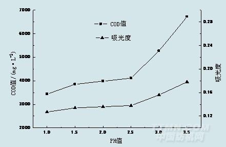圖2 PH值對(duì)吸光度及COD值得影響