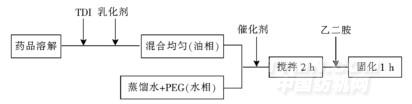 油相配制:取1.39g防蚊劑充分溶解于1.11 g環(huán)己酮中,加入2.00 g TDI和5.50 g自制乳化劑,混合均勻,得到油相。