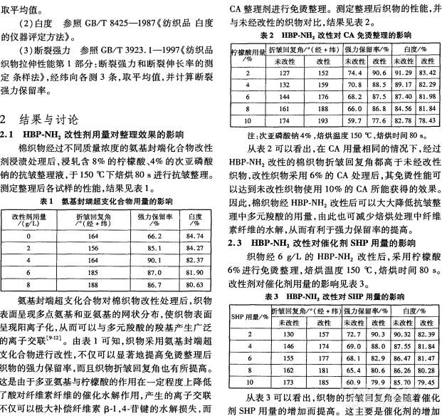 (1)折皺回復(fù)角 參照GB/T 3819-1997(紡織品織物折痕回復(fù)性的測(cè)定回復(fù)角法》,經(jīng)緯向各測(cè)4次, 由表4可知,溫度的提高使織物折皺回復(fù)角不斷提高,因?yàn)楦邷赜欣诳椢锱c檸檬酸的酯化交聯(lián)反應(yīng),提高抗皺性能,但同時(shí)織物強(qiáng)力損傷加大。在相同焙 烘溫度下,HBP—NH 改性后織物的折皺回復(fù)角及強(qiáng)力 保留率均高于未改性棉織物。因此,使用多氨基化合 物改性劑對(duì)織物進(jìn)行改性,同樣可以降低多元羧酸抗 皺整理中焙烘處理的溫度。