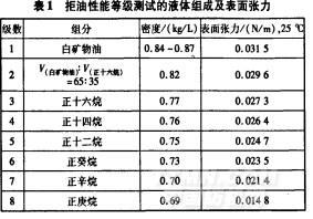 參照AATCCl 18--2002(FZ/T01067—1999)《拒油性耐碳?xì)浠衔镌囼?yàn)》。拒油性分8級,l級最差,8級最好。拒油整理液組成及表面張力見表l。