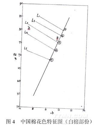 在圖4的園點上作者標注1~5級,可以看出:2級比1級白(十b值偏?。?;3級比2級白(十b值偏?。?;……5級比1級更白(十b值偏小很多)。這與GB1103--2007《棉花細絨棉》中,關于對各級色特征的文字說明是背道而馳的;也與棉花分級員的實踐經(jīng)驗是格格不入的;也與優(yōu)棉優(yōu)價政策是不相符的。