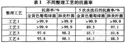 分別采用 1 .2節(jié)工藝 1~ 4對染色后的絲光棉紗線(灰色) 進(jìn)行抗菌整理, 測定整理后及水洗后紗線的抗菌效果 , 結(jié)果見表 1 。