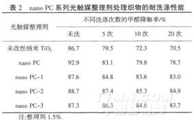 由表2可知,用未改性納米Ti02或nano PC處理的織物洗滌后,其降解VOC的能力下降,且洗滌次數(shù)越多,下降幅度越大,而加入交聯(lián)劑后,光觸媒劑(如nano PC-1、nano PC-2和nano PC-3)由于改性或通過交聯(lián)劑的作用能使光觸媒劑交聯(lián)或接枝到纖維上,形成共價(jià)鍵結(jié)合,提高了纖維與整理劑的結(jié)合牢度,使得織物降解VOC的耐洗性有較大幅度的提高,經(jīng)20次洗滌后,其降解VOC的能力無明顯下降,因此,經(jīng)該整理劑處理后織物可獲得較持久的光催化效果.