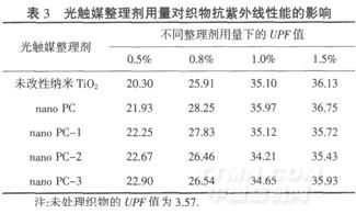 由表3可知,隨著整理劑用量增加,抗紫外線能力提高;1.0%后,抗紫外線能力(UPF值)可超過35,比未處理織物提高了8倍多.
