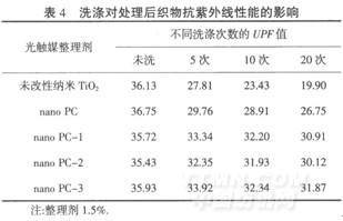 由表4可知,未改性納米Ti02處理的織物洗滌后,其抗紫外線能力顯著下降,且洗滌次數(shù)越多,下降幅度越大.而經(jīng)過nano PC系列光觸媒整理劑處理的織物,尤其是與交聯(lián)劑復(fù)合的整理劑(如nano PC-1、nanoPC-2和nano PC-3),由于其與纖維發(fā)生了共價(jià)鍵的接枝或交聯(lián)反應(yīng),提高了纖維與整理劑的結(jié)合牢度[10],使得織物的耐洗性有較大幅度提高,洗滌20次后,其抗紫外線能力仍能保持較高值.