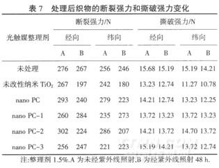 由表7可以看出,未經(jīng)紫外線照射的各類納米整理劑處理后的織物,在短時(shí)間內(nèi)的斷裂強(qiáng)力和撕破強(qiáng)力與未經(jīng)整理的織物比較,部分稍有下降或提高,但變化不大.而不同納米光觸媒整理劑整理后的織物經(jīng)紫外線照射一段時(shí)間后,則出現(xiàn)很大的差異:未改性的納米Ti02處理后的織物,經(jīng)紫外線照射48 h后,其斷裂強(qiáng)力和撕破強(qiáng)力的下降幅度大于nano PC系列納米光觸媒整理劑處理后的織物;而用nano PC系列納米光觸媒整理劑處理后的織物,經(jīng)紫外線照射后,其斷裂強(qiáng)力和撕破強(qiáng)力的下降差值低于用未改性的納米Ti02處理的織物,原因是改性納米Ti02表面存在的硅氧鍵等基團(tuán),可以隔離納米Ti02與纖維的直接接觸,對(duì)纖維有一定的保護(hù)作用,利用本文開發(fā)的系列改性納米Ti02光觸媒劑使Tioz對(duì)纖維的光氧化作用降低.可以擗龜或降低纖維的劣化覡象.