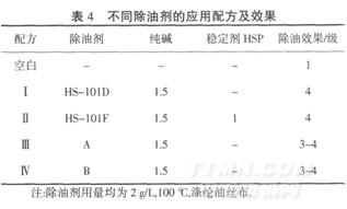 從表4看出,配方I和Ⅱ除油效果好于Ⅲ和Ⅳ.對(duì)比I和Ⅱ,HS-101D使用時(shí)不加穩(wěn)定劑較HS-101F使用更加方便,成本更低.故除油劑HS-101D從除油效果和方便使用上好于除油劑A、B和HS-101F.