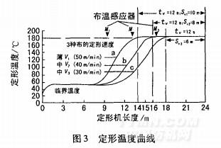根據(jù)烘房情況,在其頂部至少要設(shè)置4個非接觸式的紅外線溫度傳感器。不同織物的定形溫度曲線不同,因而需要調(diào)整車速來保證定形時間。圖3為8節(jié)烘房的定形時間控制曲線,圖中例舉了3種不同織物的定形溫度曲線。