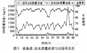 膜生物反應(yīng)器中試設(shè)備安裝調(diào)試完成后,連續(xù)運(yùn)行3個(gè)月,在滿足日處理量為5m/d的情況下,出水能夠滿足設(shè)計(jì)要求,在最佳運(yùn)行條件下出水COD能基本保持在80mg·L。以下。如圖5所示,COD去除率為95%左右;進(jìn)水色度為l6—256倍,出水為2~l6倍,色度去除率較高;SS和濁度接近于0,pH值為7—8.5。出水的CODSS、色度、濁度及pH值等指標(biāo)符合DB61—234-2006(渭河水系(陜西段)污水綜合排放標(biāo)準(zhǔn)》一級(jí)標(biāo)準(zhǔn)。