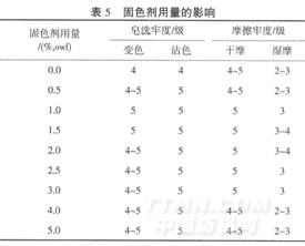 從表5可知,當(dāng)固色劑用量為1.5%(owf)時(shí),織物的應(yīng)用效果達(dá)到最佳,之后再增加固色劑用量,染色織物的色牢度有下降趨勢(shì).原因是固色劑的應(yīng)用效果與其在織物上的吸附量有關(guān)[11],當(dāng)固色劑用量在1.5%時(shí),固色劑在織物上的吸附已達(dá)到飽和,濕摩擦牢度達(dá)到3—4級(jí),繼續(xù)增加固色劑用量,牢度反而下降.因?yàn)檫^量的固色劑聚集在纖維外部,使色淀與纖維之間的結(jié)合力有所降低.因此,固色劑用量以1.50/0為宜.