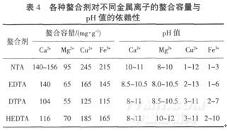 溶液的pH值對螯合容量也有影響,表4為螯合劑的螯合容量與pH值的依賴性(對不同金屬的最適宜pH值范圍內(nèi)的螯合容量).