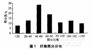 棉稈取自于江蘇蘇北地區(qū),當(dāng)年生,自然干燥(含水率為10%一16%),經(jīng)去皮、去髓和截?cái)嗪蟠谩C薅捜テとニ韬?,用粉碎機(jī)破碎成長(zhǎng)度為2~3cm的單元,經(jīng)蒸煮、熱磨制成棉稈纖維。纖維篩分分布如圖1。