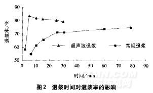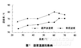 由圖l可知,超聲波退漿效果優(yōu)于常規(guī)退漿。在溫度低于℃時采用兩種方法退漿的退漿率都是隨處理溫度的升高而逐漸增大。但溫度超過60℃后.超聲波退漿率有所下降。而常規(guī)退漿則沒有下降趨勢。因為超聲波作用于液體中有一個最低的聲壓幅值(空化閉),在一定的溫度范圍內(nèi),溫度高空化閨低易于空化所以退漿效果好;但當(dāng)溫度超過一定值后.氣泡中的蒸汽壓增大,在氣泡閉合期間增強了緩沖作用而使空化減弱。在60℃時超聲波在水中的空化量達(dá)到最大(為5.8)[4]所以在超聲波環(huán)境下退漿溫度以60℃為宜。
