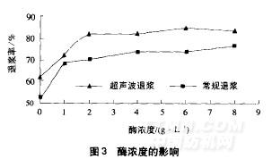 由圖3可知在超聲波和常規(guī)方法下,退漿率隨酶濃度的增加而增加超聲波退漿效果優(yōu)于常規(guī)退漿。從曲線上可以看出.超聲波退漿時酶濃度以29/L為宜而常規(guī)退漿時酶濃度要49/L產(chǎn)生這種差距的原因是超聲波空化而引起的分散作用可以使大分子之間產(chǎn)生分離促進漿料與粘著變松.并且超聲波能夠促進退漿液與漿料充分接觸,由此可見超聲波輻射作用可以減少退漿劑的用量。