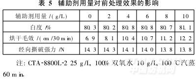 從表5看出,隨著輔助劑用量增加,織物毛效逐漸提高??紤]到成本等因素,輔助劑用量建議4~6g/L。