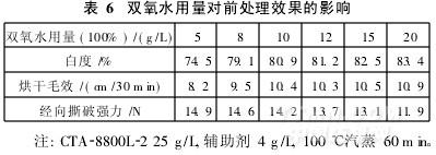 從表6可以看出,隨著雙氧水用量增大,織物毛效稍有提高,白度有較大提高,但撕破強(qiáng)力呈下降趨勢。綜合考慮,雙氧水用量以8~10g/L為宜。