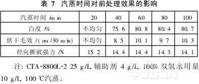試驗(yàn)所用為高支高密類織物,為提高紗線的平滑性,織造過程中通常會(huì)施加人工蠟。在前處理過程中必須予以去除,否則會(huì)出現(xiàn)蠟絲或毛效低等問題,影響后續(xù)染色的染深性和均勻性。將浸軋氧漂液后的棉織物汽蒸不同時(shí)間,測試處理后織物的性能,結(jié)果見表7。