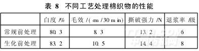 從表8可以看出,與常規(guī)工藝相比,采用連續(xù)式生化前處理工藝,織物的各項指標(biāo)均有提高,毛效提高25%以上,撕破強力提高9%,退漿率提高2級。