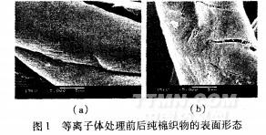與傳統(tǒng)的堿退漿、煮練工藝相比,生物酶前處理具有強(qiáng)力損失小、手感好、節(jié)約能源以及對環(huán)境友好的優(yōu)點(diǎn)。但是,生物酶價(jià)格較貴,在織物質(zhì)量指標(biāo)諸如毛效、白度、退漿率等方面,也與傳統(tǒng)燒堿處理存在一定的差距。因此,如果采用等離子體與酶聯(lián)合工藝,在印染廠生產(chǎn)過程中不但可以在退煮工藝中完全不用堿;更可以提高紡織品處理質(zhì)量(諸如減小強(qiáng)力損失,提高柔軟度等)。
