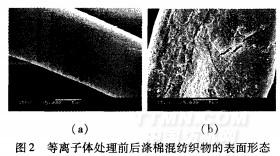由圖1和圖2可以看出,未經(jīng)處理的純棉和滌棉混紡織物,纖維表面完全被漿料包覆;經(jīng)等離子體處理后,纖維表面的漿料出現(xiàn)了凹坑和裂紋,有利于燒堿或生物酶滲入,并快速溶脹分解漿料。因此,經(jīng)等離子體處理后的棉及滌棉混紡織物,采用較低的化學(xué)品濃度就可能達(dá)到前處理工藝的要求。