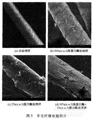 從圖5可看出,未處理羊毛纖維表面鱗片完整光滑,輪廓清晰,排列緊密。單獨(dú)使用角蛋白酶處理后,羊毛鱗片依然很完整,只是邊緣有一點(diǎn)凸起。這是因?yàn)閱为?dú)使用角蛋白酶處理對鱗片的降解不夠強(qiáng)烈,鱗片破壞不明顯。單獨(dú)使用蛋白酶處理后,羊毛纖維表層變得粗糙,鱗片張開且邊緣翹起,說明蛋白酶的水解作用主要是針對鱗片細(xì)胞問復(fù)合物。經(jīng)角蛋白酶+蛋白酶一浴法處理后,羊毛表面鱗片明顯受到破壞,大部分鱗片已基本剝離,纖維表面變得光滑。說明角蛋白酶+蛋白酶一浴法處理的降解效果相當(dāng)強(qiáng)烈,羊毛鱗片已基本剝離。