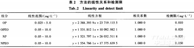 在本文確定的實(shí)驗(yàn)條件下,OP和OPEO,NP和NPEO分別在0.025~5.0mg/L及0.05~10.0mg/L范圍內(nèi)與響應(yīng)值有很好的線性關(guān)系,各化合物的線性范圍、線性方程及其相關(guān)系數(shù)見(jiàn)表2。采用標(biāo)準(zhǔn)溶液檢測(cè)限(SIN=5)作為方法的檢測(cè)限,結(jié)果也列于表2中。
