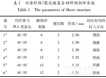由于一次模壓后板材一面成型并不很好,現(xiàn)按以上工藝進(jìn)行二次模壓獲得較成功的復(fù)合材料板材預(yù)制件,預(yù)制件結(jié)構(gòu)參數(shù)見表1。