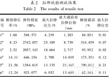 按照國標(biāo)GB/T2035-1996,用手鋸將開發(fā)形成的竹原纖維/聚乳酸復(fù)合材料板材沿橫向、縱向和斜向三個(gè)方向裁剪,最寬為20mm,最窄為10mm,長為180mm,各3塊,在實(shí)驗(yàn)室溫濕度下(18℃、50%),在INSTRON萬能強(qiáng)力機(jī)上進(jìn)行拉伸試驗(yàn),拉伸速度為10mm/min,試驗(yàn)結(jié)果如表2所示。