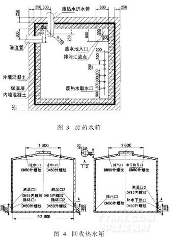 該分系統(tǒng)的功能是負(fù)責(zé)各種能源介質(zhì)的輸送和儲存。系統(tǒng)設(shè)有廢熱水箱(圖3)、回收熱水箱(圖4)及輸送管路,根據(jù)實(shí)際生產(chǎn)需要及時(shí)儲存或供應(yīng)熱水。該分系統(tǒng)采用先進(jìn)的保溫結(jié)構(gòu)及保溫材料,實(shí)現(xiàn)了回收過程熱能損失的最小化,保溫?zé)崴疁孛?4h只下降1~3℃。
