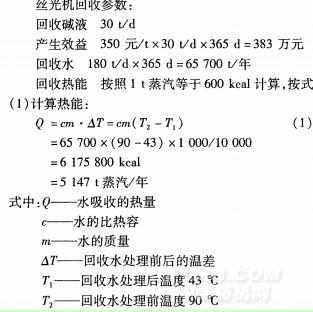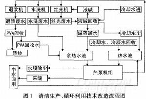 染整加工過程廢水的回用,首先要通過各類回收裝置(PVA回收、堿回收等),將消耗的化學(xué)物料予以回收,然后通過熱泵機(jī)組提取廢水中的熱能,再經(jīng)過中水回用裝置,輸送到各機(jī)臺,達(dá)到從源頭控制,實(shí)現(xiàn)清潔生產(chǎn)的目的。圖1為清潔生產(chǎn)、循環(huán)利用技術(shù)改造流程示意