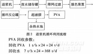 退漿機(jī)的回收裝置采用德國PVA(聚乙烯醇)回收裝置,將退漿機(jī)產(chǎn)生的退漿廢水首先收集到廢水儲存罐(需進(jìn)行伴熱保溫處理)中。廢水通過振動篩網(wǎng)過濾裝置,將其中的花毛懸浮物、沉淀物等雜質(zhì)過濾,進(jìn)人脫色裝置,脫色后再進(jìn)入循環(huán)反應(yīng)罐,在超濾膜與循環(huán)反應(yīng)罐之間實(shí)現(xiàn)退漿廢水的回收利用。當(dāng)循環(huán)反應(yīng)罐中的PVA濃度達(dá)到要求濃度時(shí),PVA回收至回收容器,產(chǎn)生的回收水進(jìn)入余熱水池。退漿機(jī)循環(huán)利用流程如圖2所示: