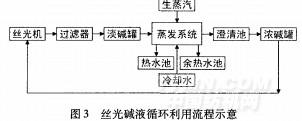 將絲光機(jī)的淡堿液收集到集水罐,由淡堿輸送泵送到蒸發(fā)系統(tǒng)的預(yù)處理,即精密過濾器過濾去除布毛纖維;過濾后收集到淡堿貯罐,由淡堿泵(進(jìn)料泵)輸送進(jìn)入四效蒸發(fā)系統(tǒng)進(jìn)行蒸發(fā)濃縮;濃縮后由濃堿泵(出料泵)輸送到濃堿罐,或經(jīng)過澄清池澄清分離,上清液進(jìn)入濃堿罐;最后由濃堿輸送泵送至車間使用。絲光堿液循環(huán)利用流程如圖3所示。