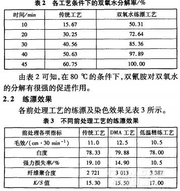 分別測(cè)定傳統(tǒng)工藝在80°C和低溫練漂工藝80°C條件下的雙氧水分解率,結(jié)果如表2所示。