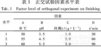 試樣為亞麻織物2g/塊,浴比1∶25,進行溫度、pH值、酶用量、時間四因素的L9(34)正交試驗,試驗因素水平見表1,結(jié)果見表2。