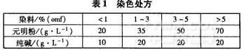 工藝流程室溫人染(浴比1:30)加元明粉→10min升溫至40℃→加堿劑,40℃固色90min后處理→冷水洗→1ooqC皂洗5min(102皂洗劑1g/L,浴比1:30)→冷水洗→烘干