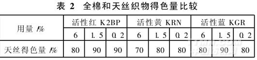 試驗(yàn)結(jié)果顯示,天絲織物得色量均比全棉淺,以全棉織物得色量為標(biāo)準(zhǔn)(100%)進(jìn)行比較,結(jié)果見表2。
